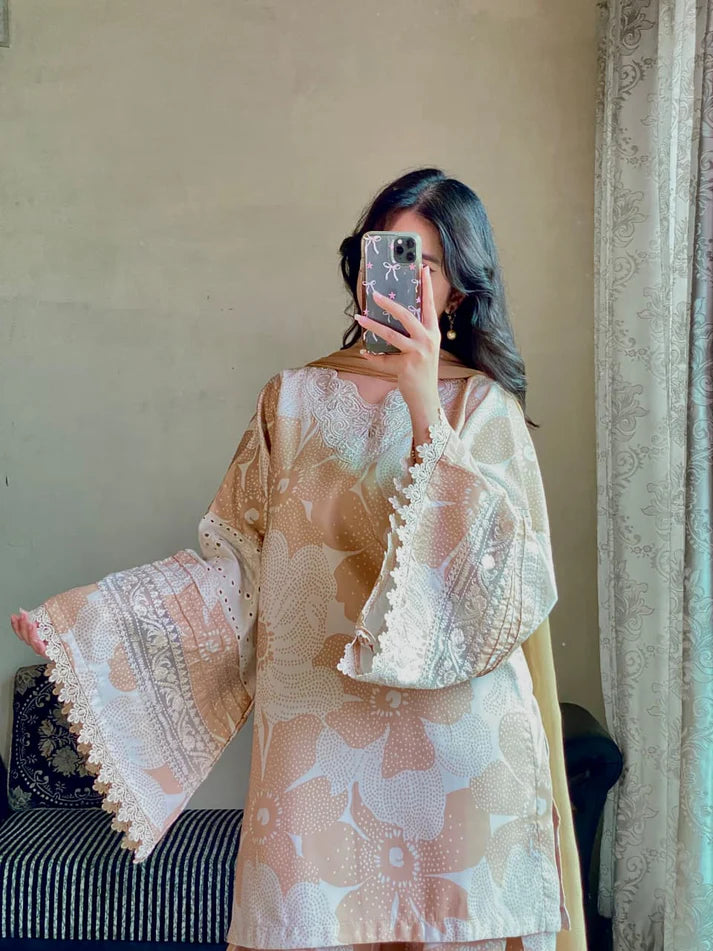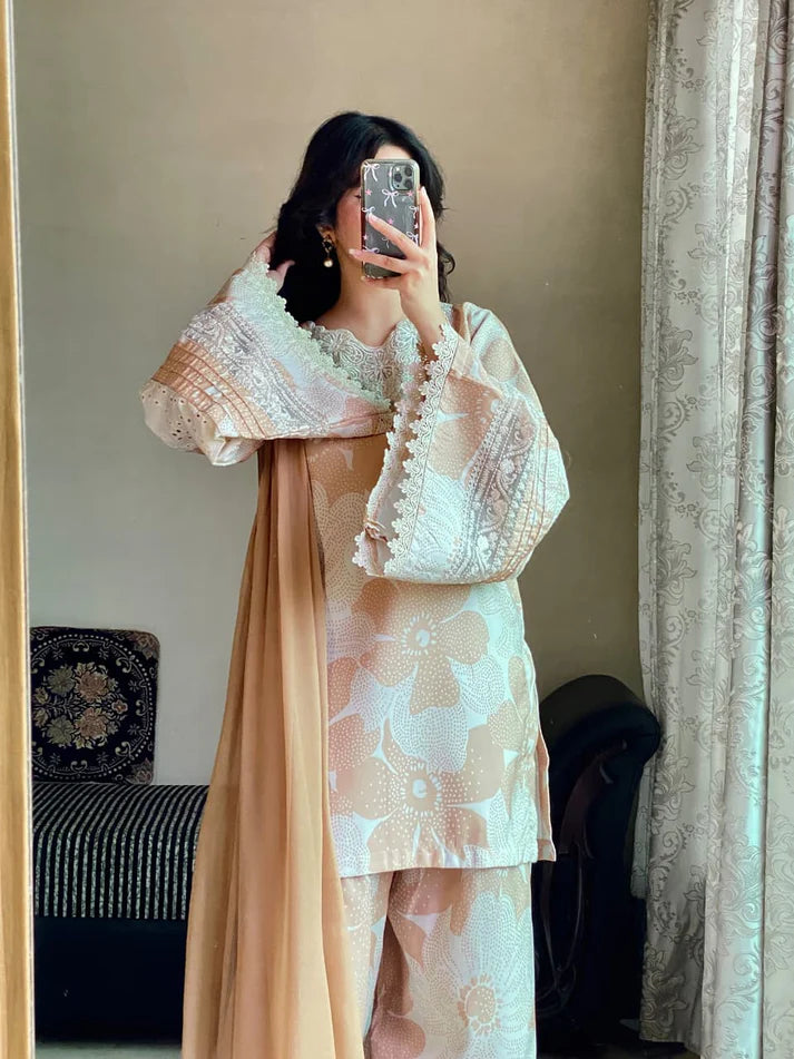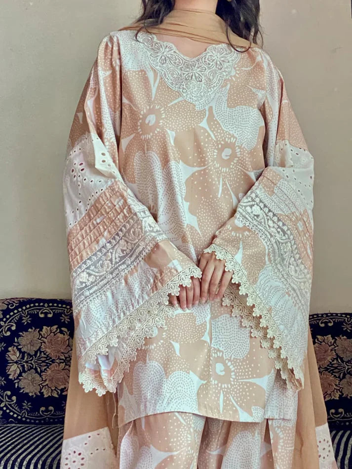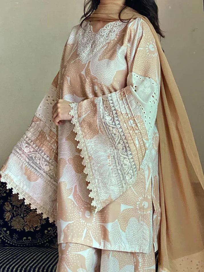 This exquisite 3-piece stitched Karandi digital printed farshi shalwar set embodies timeless grace and modern charm. The shirt features delicate neck embroidery with intricate sleeve detailing, enhanced by shuttle-less lace embroidered patches, pleats work, and chicken embroidery. Paired with a flowing farshi-style shalwar, it ensures both comfort and elegance. The chiffon dupatta, adorned with digital printed patti, shuttle-less lace, and chicken embroidery on both pallus, completes the look, making it a perfect ensemble for festive and semi-formal occasions.